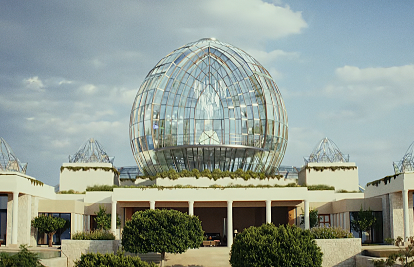 Wszechogarniająca biel nieco ocieplona została zielenią roślin palmowych. Marmur na ścianach, podłogach i sufitach miesza się ze szkłem zastosowanym jako blat stołu i balustrady.